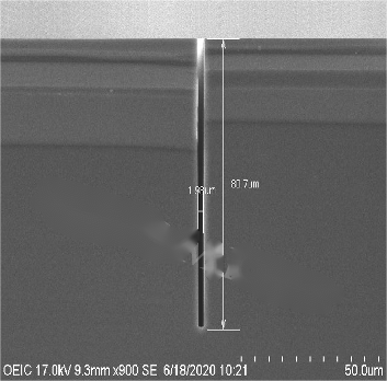通過(guò)對(duì)工藝參數(shù)的優(yōu)化,得到了下圖為2μm線(xiàn)寬刻蝕深度80微米,深寬比達(dá)40:1。